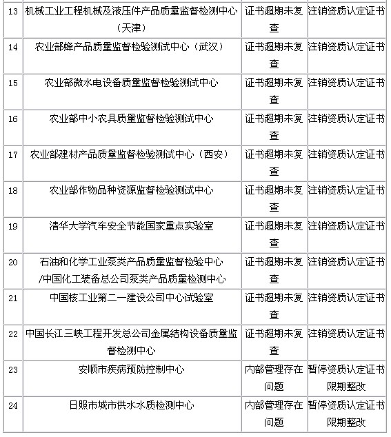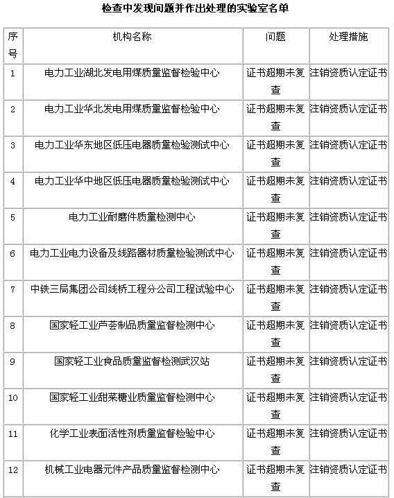 1.此次檢查發(fā)現(xiàn)了個別實驗室的質(zhì)量管理體系存在較大問題,部分實驗室證書到期未申請復查(名單見附件),將分別采取限期整改或者注銷資質(zhì)認定證書的處理措施。